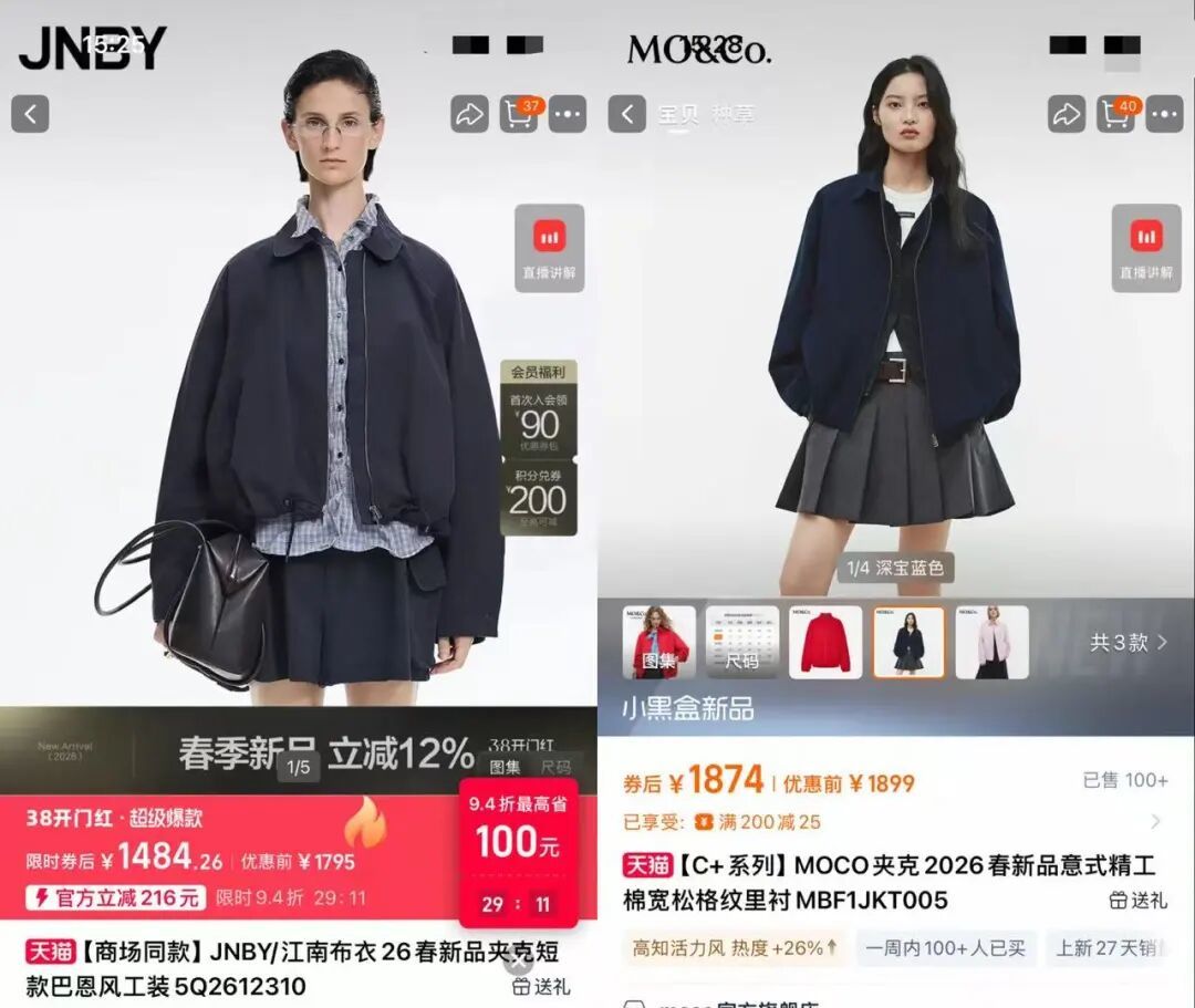 从左到右:JNBY2024、2025、2026年春牛仔外套 图源:JNBY官方小程序、得物App、JNBY天猫官方旗舰店